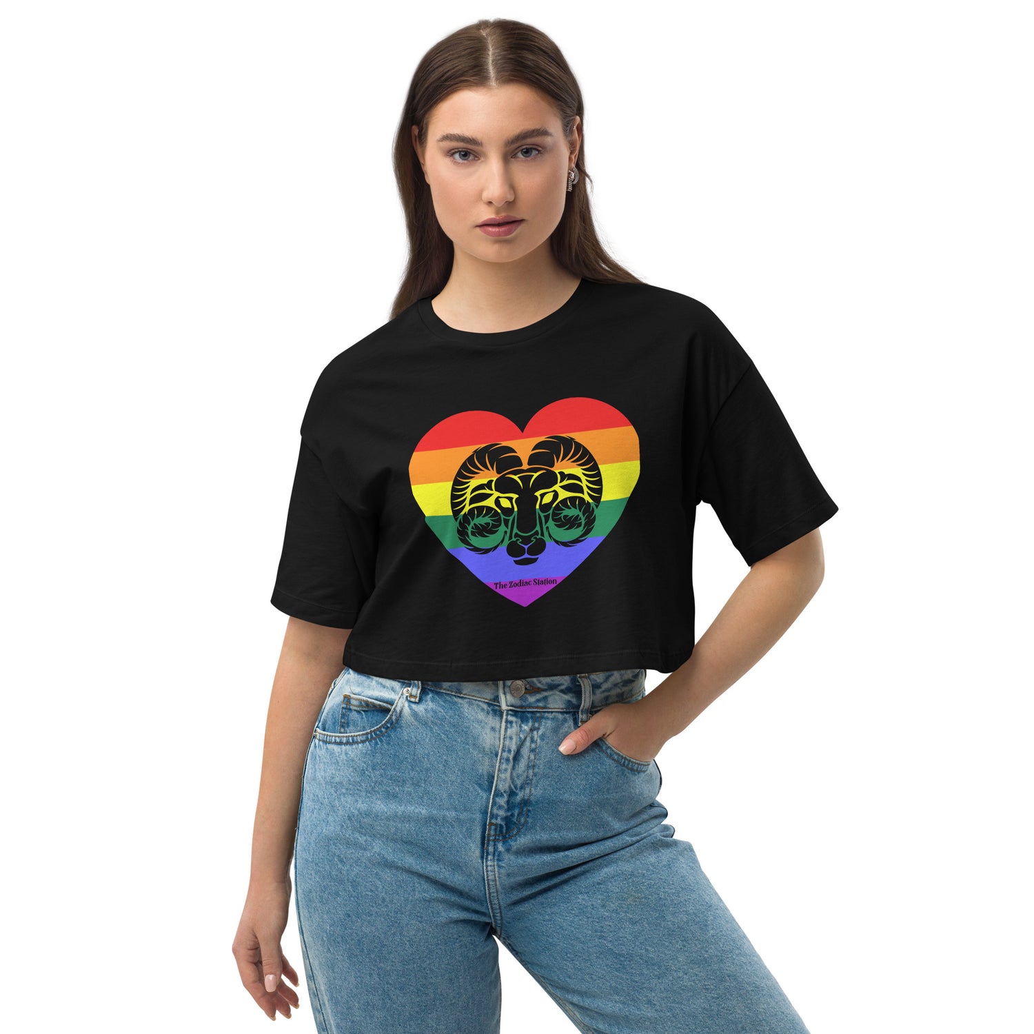 Aries Zodiac Crop Top Loose drop shoulder Rainbow Heart The Zodiac Station